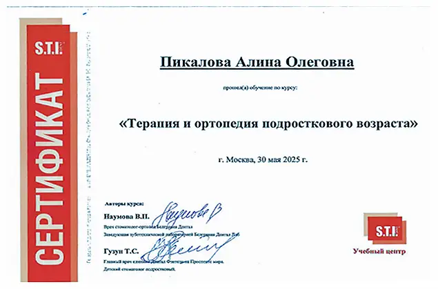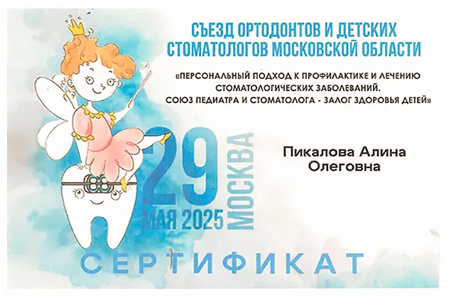 Данные об аккредитации или сертификате специалиста (специальность, срок действия): № 111831 0700428, Стоматология детская, до 25.12.2020